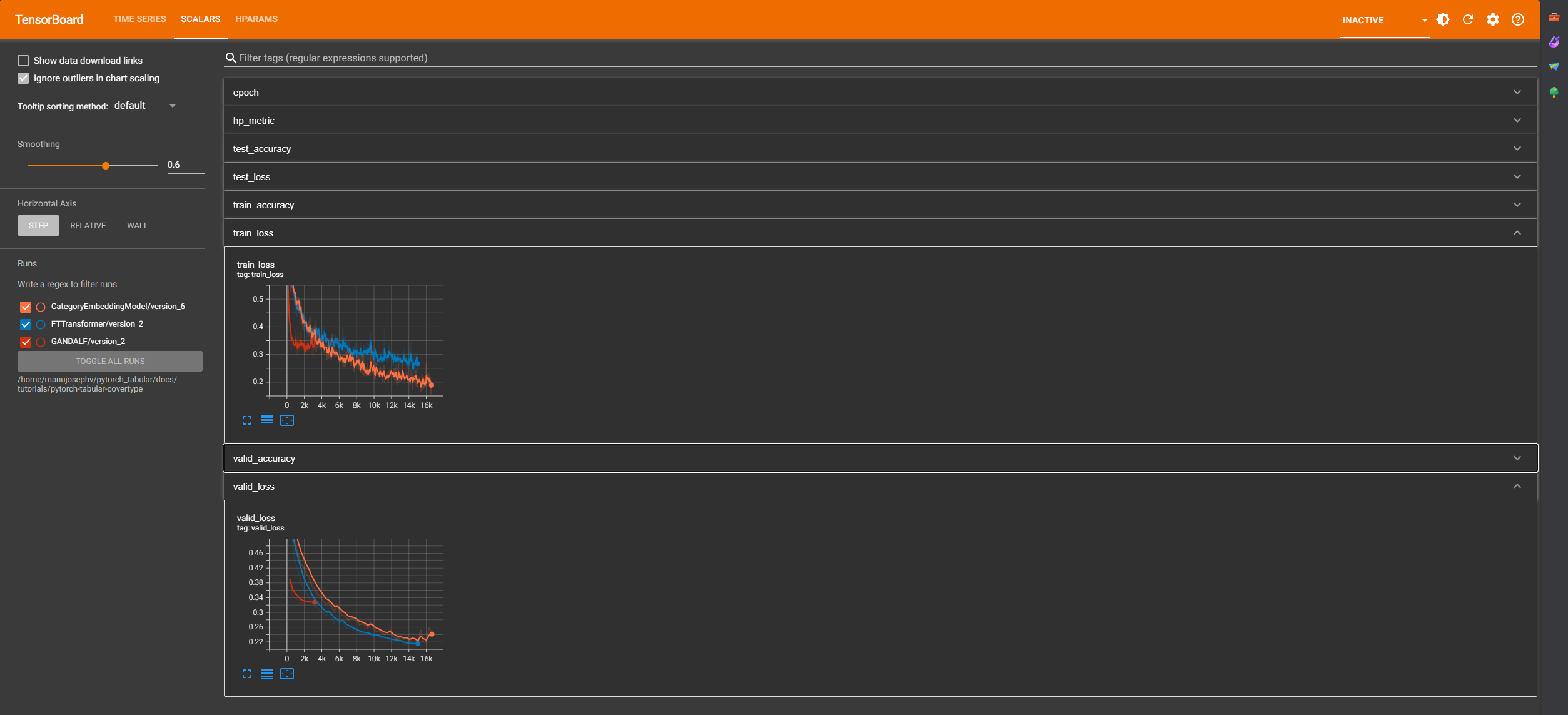 Now let's see how we can get all these benefits for free with PyTorch Tabular and Tensorboard (comes pre-installed with PyTorch Lightning). Although not as feature rich as Weights and Biases, Tensorboard is a classic offline tracking solution.